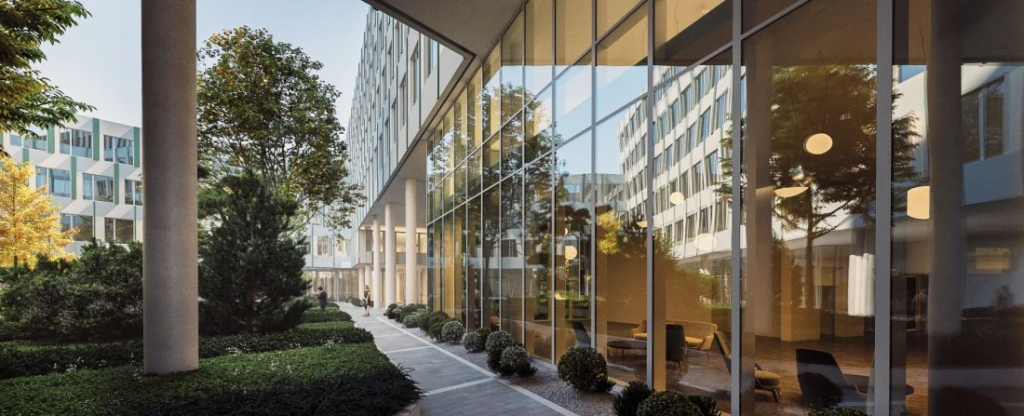 A ZDA-Zoboki Építésziroda négy, aszimmetrikus, hullámzó formájú tömböt képzelt el egy zárt belső udvar köré.