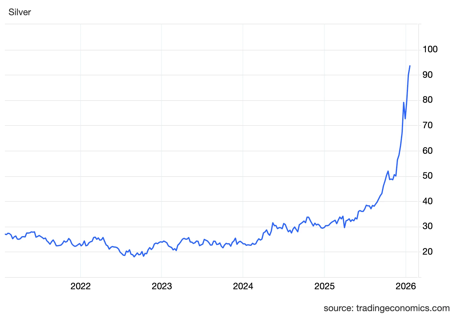 Az ezüst árfolyama 2026. január 20-án érte el a történelmi csúcsot, unciánkénti 95,34 dolláros értékkel. A legtöbb elemző biztosra veszi, hogy csak idő kérdése, hogy mikor lépi át a fehér fém a 100 dollárt, ahonnan az Equilor elemzője szerint elindulhat a korrekció. Azonban a lefelé mutató mozgás csak átmeneti lesz, a befektetők hamar meg fogják találni a következő beszállási pontot, ahonnan folytathatja a menetelést az ezüst.
