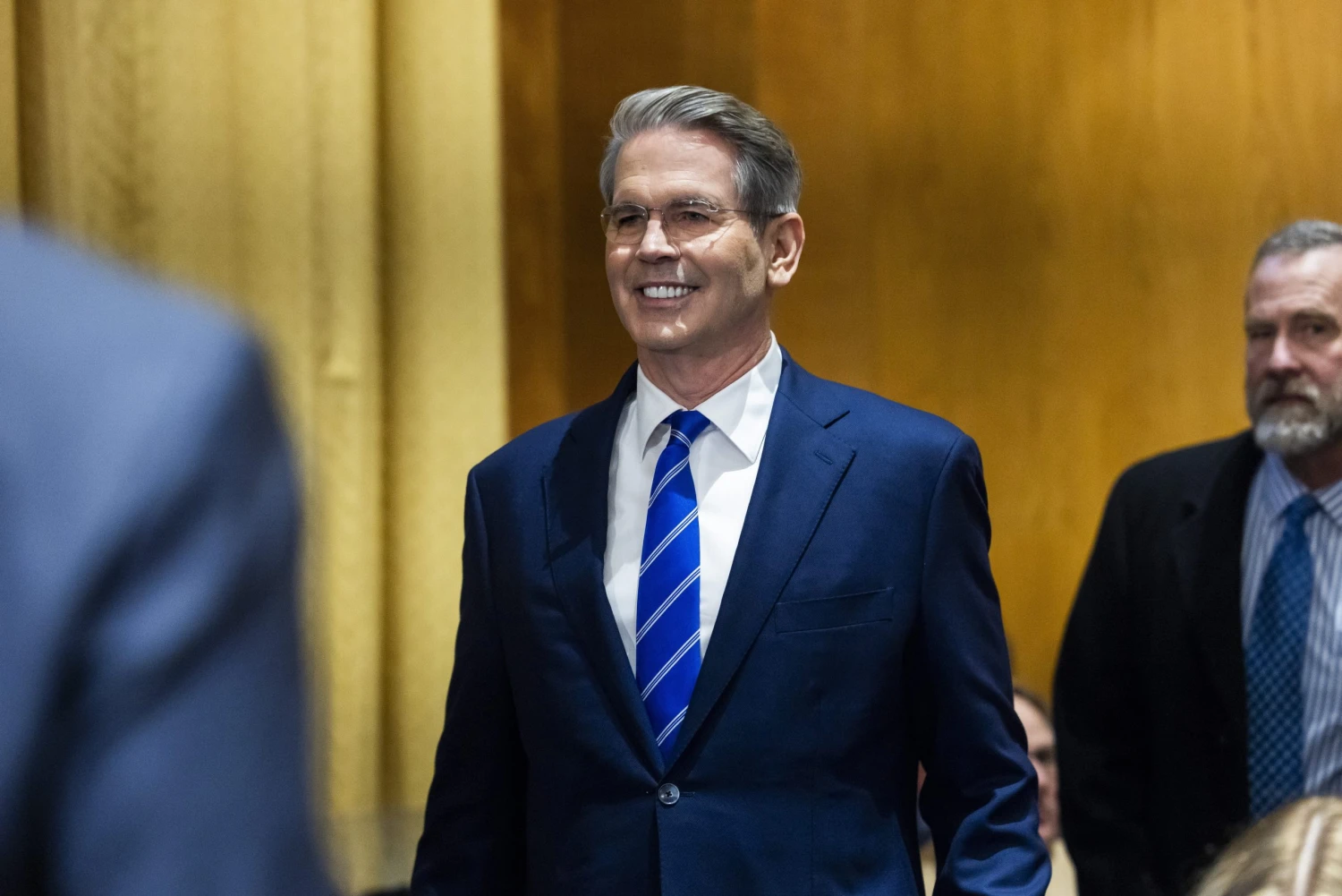 Scott Bessent befektetési szakember, Donald Trump megválasztott amerikai elnök pénzügyminiszter-jelöltje a szenátus pénzügyi bizottságának meghallgatására érkezik a washingtoni Dirksen szenátusi irodaházban 2025. január 16-án.